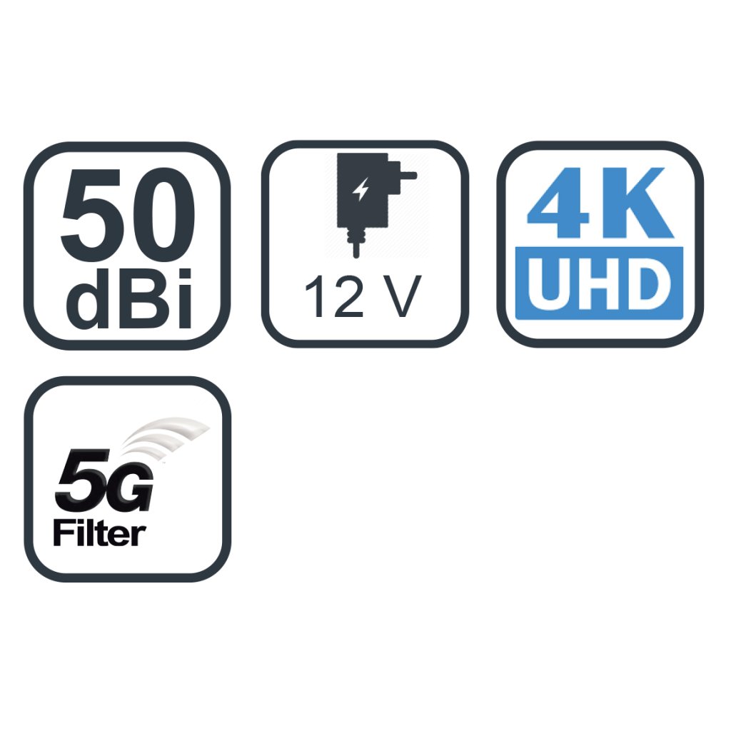 aktívna izbová anténa, na príjem FM/DAB+/DVB-T2, zosilňovač, zisk 50 dBi, LTE, 4G, 5G filter, napájací adaptér, konektor IEC male